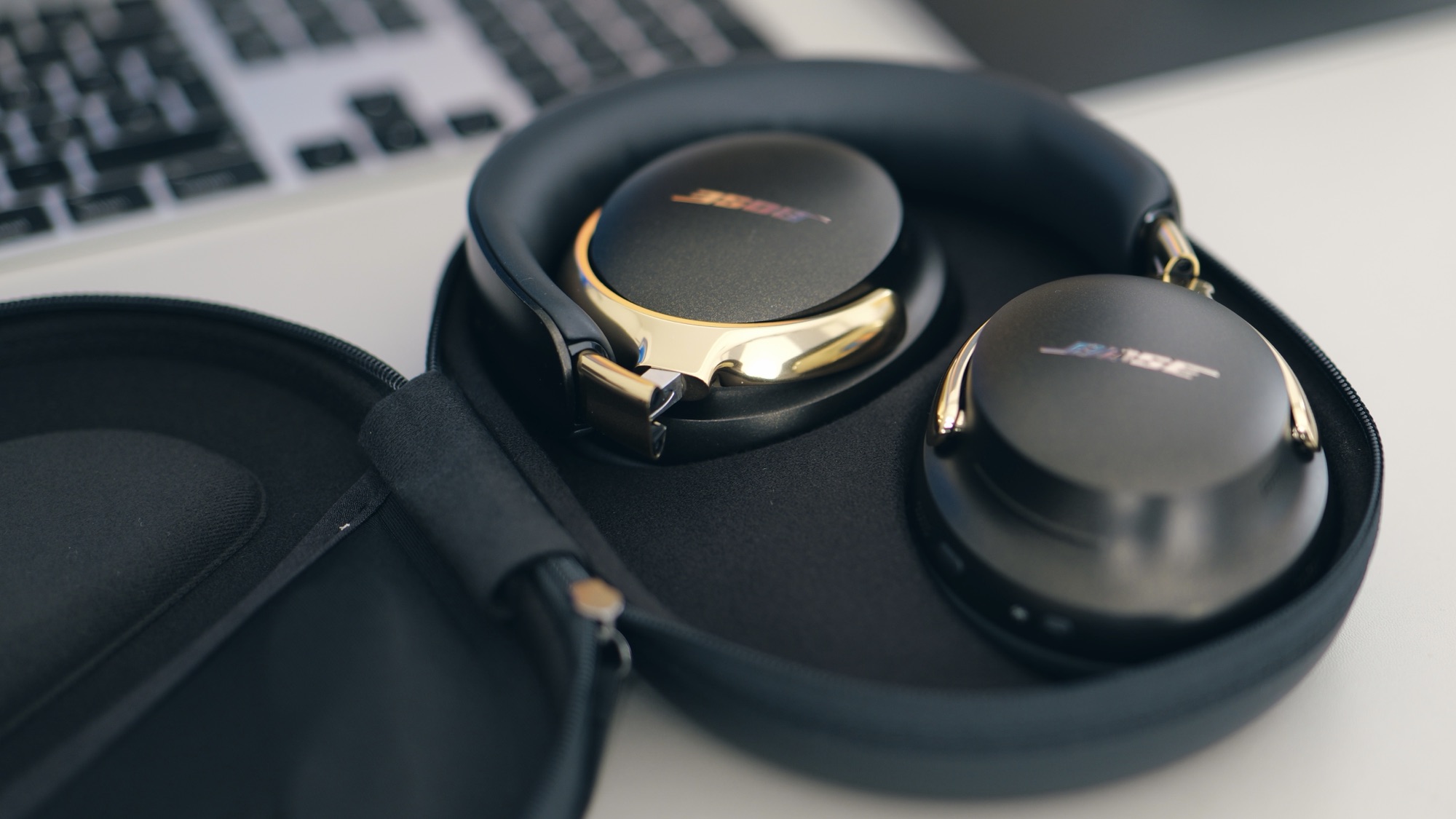 Das mitgelieferte Hardcase folgt der bewährten Bose-Linie: kompakt, widerstandsfähig und clever aufgeteilt. Es bietet Platz für Kabel, Adapter und sogar ein kleines Fach für persönliche Accessoires. Der Reißverschluss läuft butterweich, das Case selbst ist farblich auf die Kopfhörer abgestimmt – bei der goldenen Variante in einem eleganten, warmen Ton mit feinem Glanz.