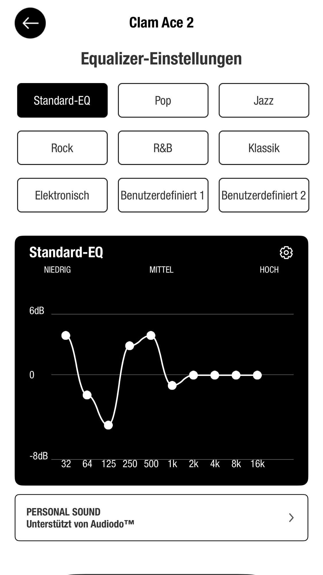 Das klingt nach Marketing, funktioniert aber erstaunlich gut. Nach dem Test klingt der Clam Ace 2 deutlich offener, mit klareren Höhen und besser definierter Räumlichkeit. Gerade bei älteren Hörern – oder einfach Menschen, die in bestimmten Frequenzen empfindlicher oder unempfindlicher sind – kann das ein echter Gamechanger sein.
