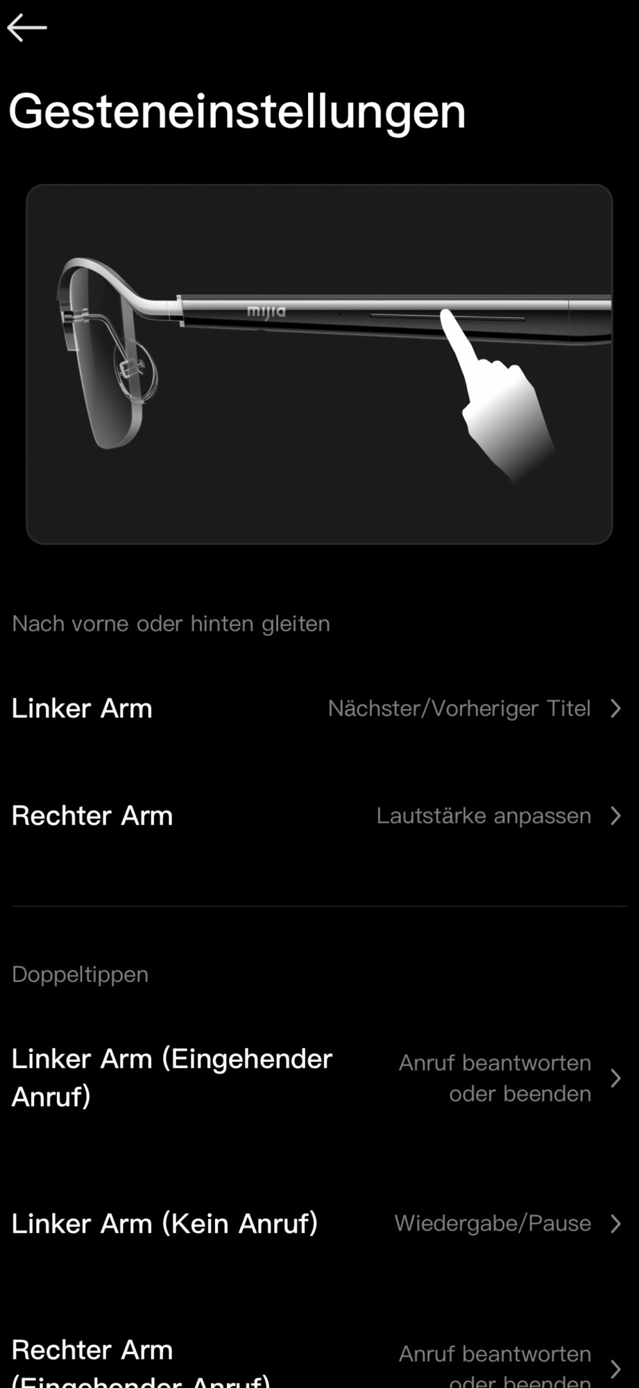 Die Steuerung der Mijia Smart Audio Glasses erfolgt über Touchflächen an beiden Bügeln. Xiaomi setzt dabei auf Gesten wie Wischen, Doppeltippen und Gedrückthalten, die sich über die Xiaomi Glasses App individuell konfigurieren lassen. Das Grundprinzip ist schnell verstanden und erfordert keine lange Lernkurve.